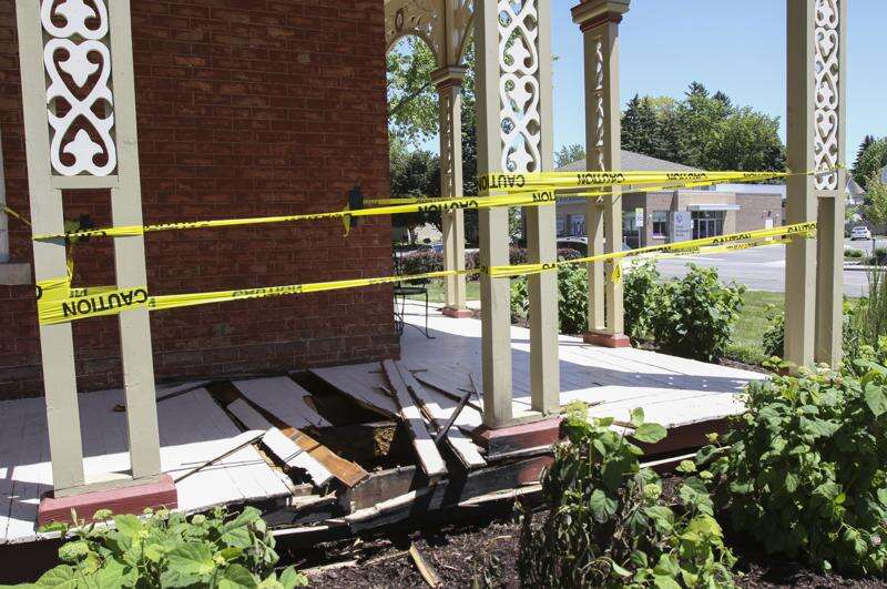 Part of the porch of a 150-year-old office building on Washington Street near downtown Naperville was roped off after a mulch fire damaged it Wednesday morning, authorities said. Bev Horne/bhorne@dailyherald.com