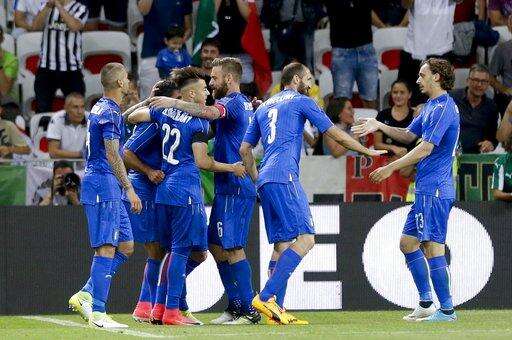 Italian players celebrate after Eder scored during a friendly soccer match between Italy and Uruguay, at the Nice Allianz Riviera stadium, France, Wednesday, June 7, 2017. (AP Photo/Claude Paris) The Associated Press