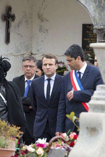 FILE - In this April 28, 2017 file photo then French independent centrist presidential candidate Emmanuel Macron, center, listens to the mayor of Oradour-sur-Glane, Philippe Lacroix, right, while visiting the French martyr village of Oradour-sur-Glane, central France, French President Emmanuel Macron has called on young people to remember past wars and use democratic means to fight against today's barbarities during a commemoration Saturday, June 10, 2017 at the site of the deadliest massacre in Nazi-occupied France. Macron told 500 children aged 12 to 16 in Oradour-sur-Glane in western France that "we would like to be able to say that from now on this happens away from home or that it no longer happens. (AP Photo)