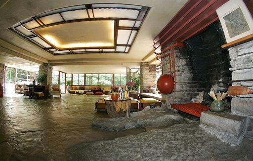 This Aug. 23, 2007 photo shows the fireplace and living room area of Fallingwater, a home built over a waterfall in Big Run, Pa. It is one of Frank Lloyd Wright's best-known works. (AP Photo/Keith Srakocic) The Associated Press