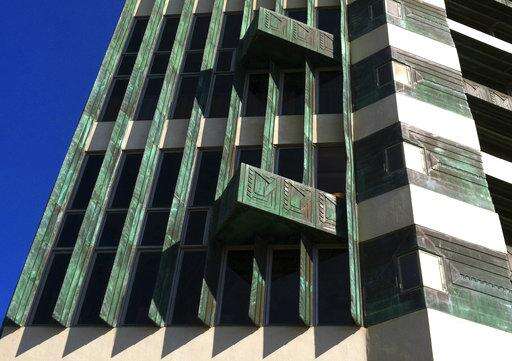 This Sept. 26, 2014 photo shows architectural details of Frank Lloyd Wright's Price Tower in Bartlesville, Okla. (AP Photo/Beth Harpaz) The Associated Press