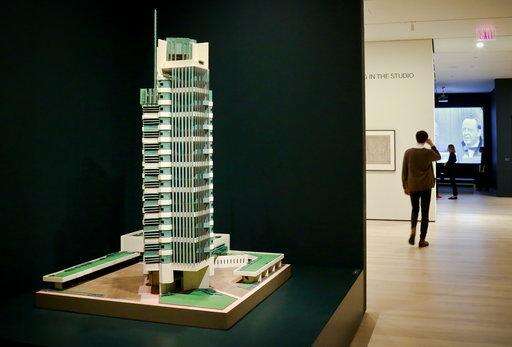 This June 8, 2017, photo shows a 1952 model of architect Frank Lloyd Wright's Price Tower hi-rise, which was built in Bartlesville, Okla., is displayed at the press preview for the MOMA exhibition, "Frank Lloyd Wright at 150: Unpacking the Archive," in New York. (AP Photo/Bebeto Matthews) The Associated Press