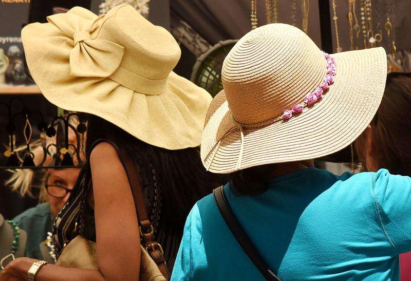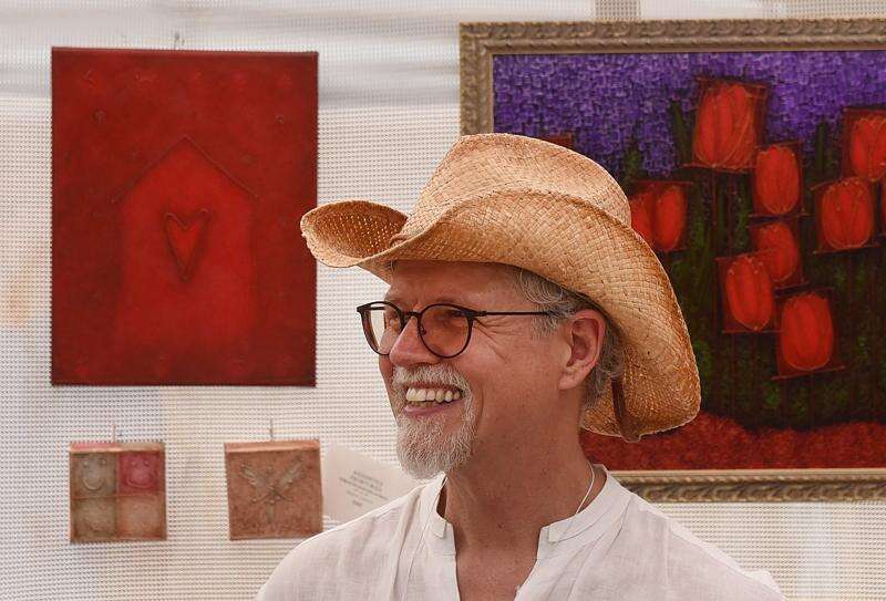 It was a good day for hats, as Kevin Lahvic of Chicago stands in front of his art work at the Arlington Heights Promenade of Art Saturday downtown. Bob Chwedyk/bchwedyk@dailyherald.com