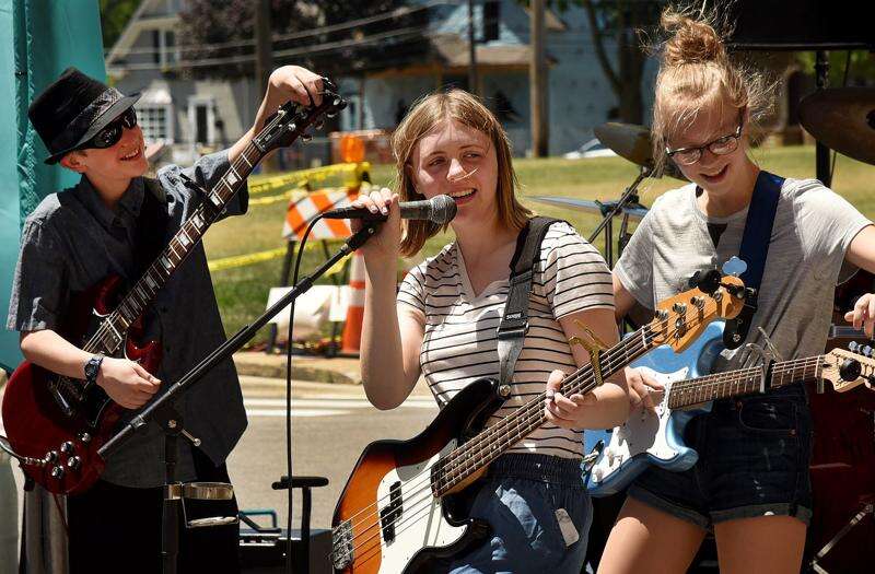 From left, Ryan Carlson, Lucy Hewitt, and Bailey Carlson perform their brand of rock music at the Arlington Heights Promenade of Art Saturday downtown. Bob Chwedyk/bchwedyk@dailyherald.com