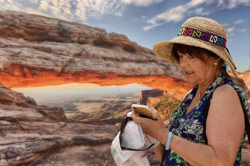 Nickie Pedrick of Buffalo Grove appears to be texting a message from a mountain scene out west instead of the Arlington Heights Promenade of Art Saturday downtown. Bob Chwedyk/bchwedyk@dailyherald.com