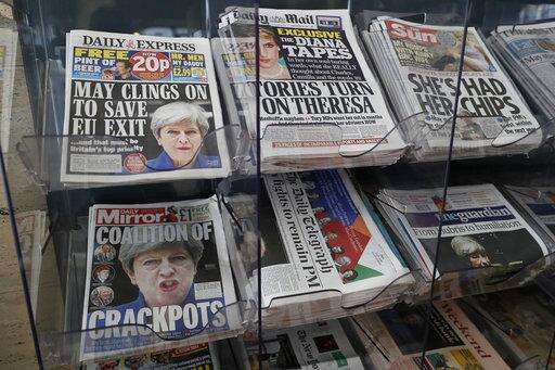 May's position seems safe for the near future because Britain must start negotiations later this month on leaving the European Union, but most British newspapers agreed Saturday that she is only just clinging on.