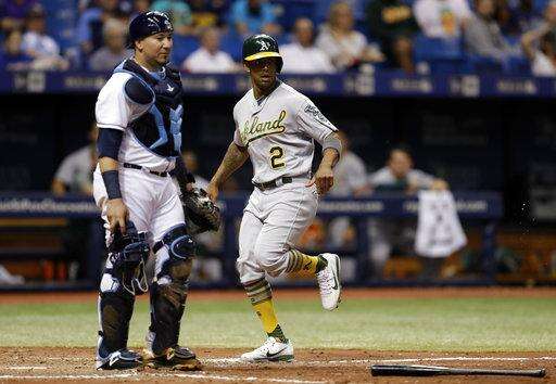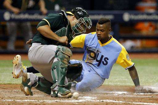 Tampa Bay Rays' Tim Beckham, right, scores on an error by Oakland Athletics catcher Josh Phegley during the sixth inning of the first game of a scheduled baseball doubleheader Saturday, June 10, 2017, in St. Petersburg, Fla. (AP Photo/Chris O'Meara)
