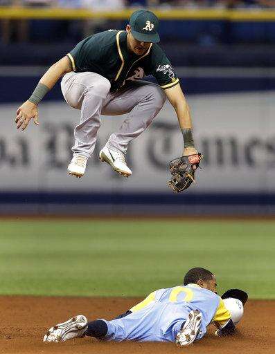 Oakland Athletics shortstop Chad Pinder leaps over Tampa Bay Rays' Mallex Smith (0) to field a high throw as Smith steals second base during the fifth inning of the first game of a scheduled baseball doubleheader Saturday, June 10, 2017, in St. Petersburg, Fla. (AP Photo/Chris O'Meara)