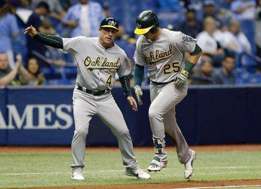 Oakland Athletics' Ryon Healy (25) celebrates with third base coach Chip Hale (4) after hitting a home run off Tampa Bay Rays starting pitcher Ryne Stanek during the seventh inning of the second game of a scheduled baseball doubleheader Saturday, June 10, 2017, in St. Petersburg, Fla. (AP Photo/Chris O'Meara)