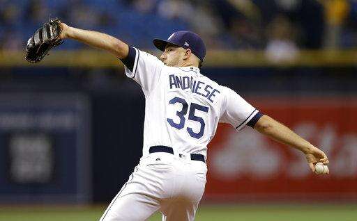 Tampa Bay Rays starting pitcher Matt Andriese delivers to the Oakland Athletics during the first inning of the second game of a baseball doubleheader Saturday, June 10, 2017, in St. Petersburg, Fla. (AP Photo/Chris O'Meara)