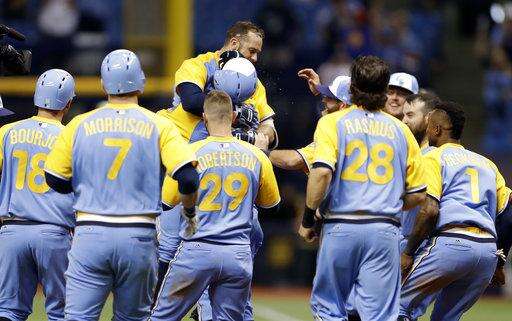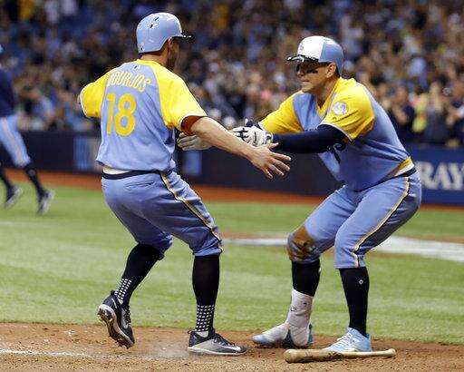 Tampa Bay Rays' Peter Bourjos (18) celebrates with Logan Morrison after scoring the game-wining run on a single by Evan Longoria off Oakland Athletics relief pitcher Liam Hendriks during the 10th inning of the first game of a scheduled baseball doubleheader Saturday, June 10, 2017, in St. Petersburg, Fla. (AP Photo/Chris O'Meara)
