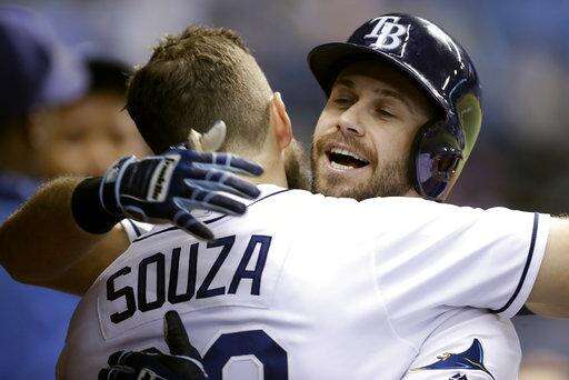 Tampa Bay Rays' Evan Longoria, right, hugs Steven Souza Jr. after Longoria hit a home run off Oakland Athletics starting pitcher Sean Manaea during the sixth inning of the second game of a baseball doubleheader Saturday, June 10, 2017, in St. Petersburg, Fla. (AP Photo/Chris O'Meara)