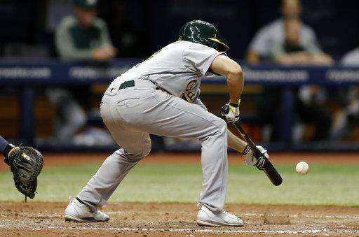Oakland Athletics's Jaycob Brugman squeeze-bunts against Tampa Bay Rays relief pitcher Jose Alvarado during the sixth inning of the second game of a scheduled baseball doubleheader Saturday, June 10, 2017, in St. Petersburg, Fla. Athletics' Khris Davis scored. (AP Photo/Chris O'Meara)