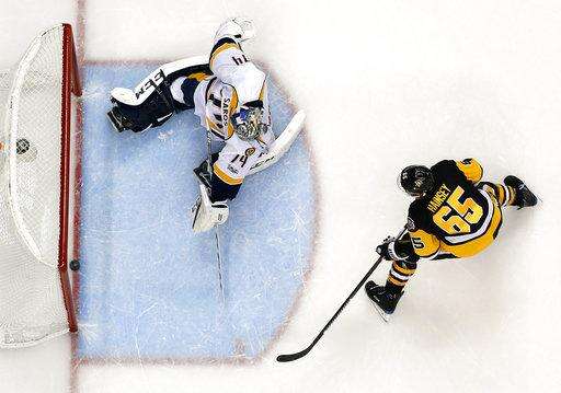 Pittsburgh Penguins' Ron Hainsey (65) gets a shot behind Nashville Predators goalie Juuse Saros (74) during the second period of Game 5 of the NHL Stanley Cup Final, Thursday, June 8, 2017, in Pittsburgh. The Penguins won 6-0. (AP Photo/Gene J. Puskar) The Associated Press