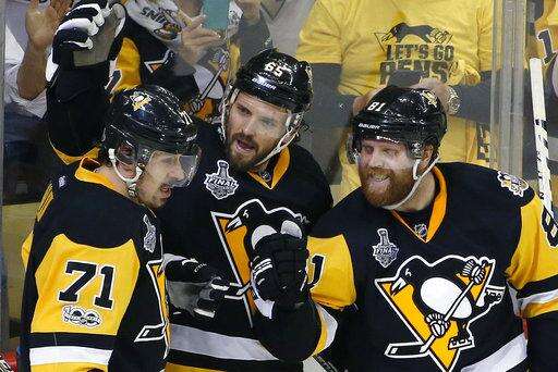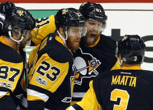 Pittsburgh Penguins' Phil Kessel, right rear, celebrates his goal against the Nashville Predators with Sidney Crosby (87), Scott Wilson (23) and Olli Maatta, right, during the second period in Game 5 of the NHL hockey Stanley Cup Final, Thursday, June 8, 2017, in Pittsburgh. (AP Photo/Gene J. Puskar) The Associated Press