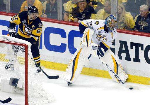 Nashville Predators goalie Pekka Rinne, right, plays the puck behind the net as Pittsburgh Penguins' Sidney Crosby (87) defends during the first period in Game 5 of the NHL hockey Stanley Cup Final, Thursday, June 8, 2017, in Pittsburgh. (AP Photo/Gene J. Puskar) The Associated Press