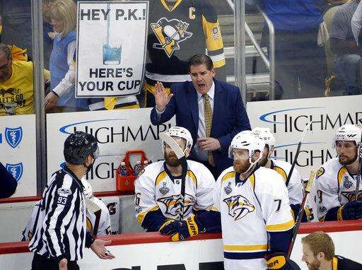 Nashville Predators coach Peter Laviolette appeals to linesman Brian Murphy, left, during the second period in Game 5 of the NHL hockey Stanley Cup Final against the Pittsburgh Penguins, Thursday, June 8, 2017, in Pittsburgh. (AP Photo/Gene J. Puskar) The Associated Press