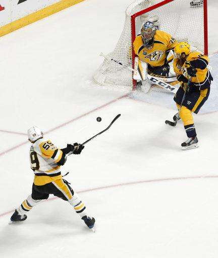 Pittsburgh Penguins' Jake Guentzel (59) shoots as Nashville Predators goalie Pekka Rinne (35), of Finland, defends the goal during the first period of Game 6 of the NHL hockey Stanley Cup Final, Sunday, June 11, 2017, in Nashville, Tenn. (AP Photo/Jeff Roberson) The Associated Press