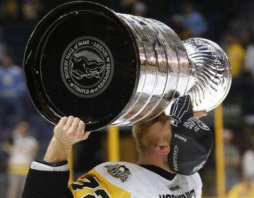 Pittsburgh Penguins' Evgeni Malkin (71), of Russia, and Sidney Crosby (87) kiss the Stanley Cup after defeating the Nashville Predators 2-0 in Game 6 of the NHL hockey Stanley Cup Final, Sunday, June 11, 2017, in Nashville, Tenn. (AP Photo/Mark Humphrey) The Associated Press