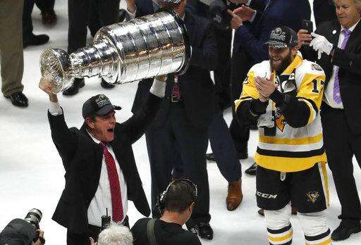 Pittsburgh Penguins head coach Mike Sullivan hoists the Stanley Cup as Bryan Rust (17) watches after defeating the Nashville Predators 2-0 in Game 6 of the NHL hockey Stanley Cup Final, Sunday, June 11, 2017, in Nashville, Tenn. (AP Photo/Jeff Roberson) The Associated Press