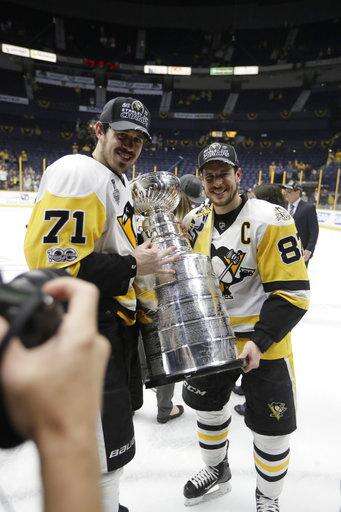 Pittsburgh Penguins' Evgeni Malkin (71), of Russia, and Sidney Crosby (87) pose for a photo with the Stanley Cup after defeating the Nashville Predators 2-0 in Game 6 of the NHL hockey Stanley Cup Final, Sunday, June 11, 2017, in Nashville, Tenn. (AP Photo/Mark Humphrey) The Associated Press