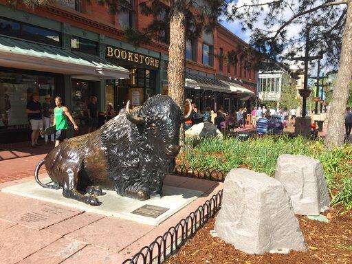 This May 13, 2017 photo shows a bison sculpture on the Pearl Street Mall in Boulder, Colo. Pearl Street has been Boulder's main shopping district since the late 19th century and a pedestrian mall since the late 1970s. Today its historic storefronts have been restored and it bustles with shoppers, street performers and children at play. The bison sculpture is a temporary installation. (AP Photo/Beth J. Harpaz) The Associated Press
