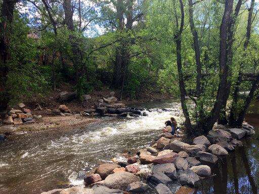 This May 13, 2017 photo shows people relaxing along Boulder Creek in Boulder, Colo. The 8-mile Boulder Creek Path alongside the waterway is a scenic trail where you can stroll, bike or just sit for a few peaceful moments. (AP Photo/Beth J. Harpaz) The Associated Press