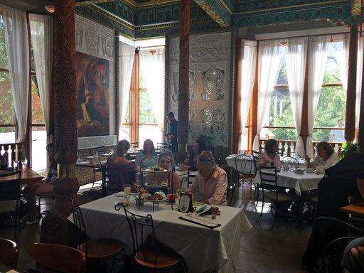 This May 13, 2017 photo shows the interior of the Dushanbe Teahouse in Boulder, Colo. Dushanbe offers a formal afternoon tea with a three-tiered tower of pastries, cucumber sandwiches and more, but it's known for the building's unique and elaborate craftsmanship, including carved columns, ceramic panels and hand-painted ceiling. The work was done by artisans from Dushanbe, the capital of Tajikistan and Boulder's sister city. (AP Photo/Beth J. Harpaz) The Associated Press