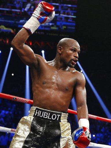 FILE - In this May 2, 2015, file photo, Floyd Mayweather Jr. celebrates during his welterweight title fight against Manny Pacquiao in Las Vegas. Mayweather Jr. said Wednesday, June 14, 2017, he will come out of retirement to face UFC star Conor McGregor in a boxing match on Aug. 26. Mayweather, who retired in September 2015 after winning all 49 of his pro fights, will face a mixed martial arts fighter who has never been in a scheduled 12-round fight at the MGM Grand arena. The fight will take place in a boxing ring and be governed by boxing rules. (AP Photo/John Locher, File) The Associated Press