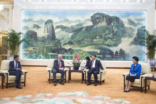 FIFA President Gianni Infantino, left, meets with China's President Xi Jinping at the Great Hall of the People in Beijing on Wednesday, June 14, 2017. (Fred Dufour/Pool Photo via AP) The Associated Press