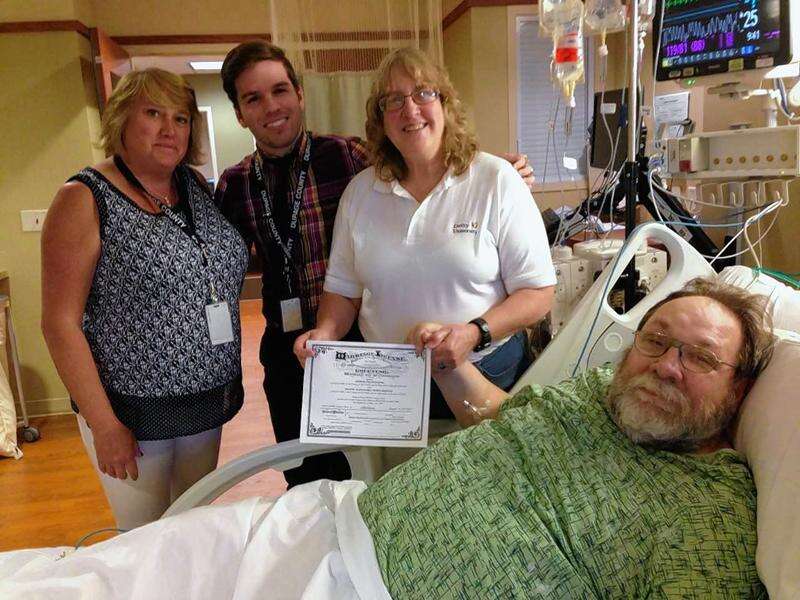 As doctors helped King get out of bed and walk, his adult daughters contacted the DuPage County clerk's office and scrambled a couple of employees out to the hospital to swear in Dolezal and King, as is required to apply for a marriage license.