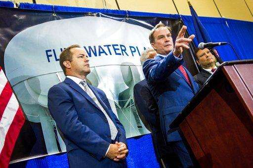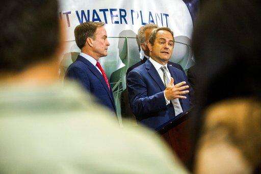 Michigan Attorney General Bill Schuette fields questions from reporters Wednesday, June 14, 2017, in Flint, Mich., after announcing charges against five water officials -- including a member of Gov. Rick Snyder's cabinet and a former emergency manager -- with manslaughter related to their alleged failure to act during the Flint Water Crisis. (Jake May /The Flint Journal-MLive.com via AP)