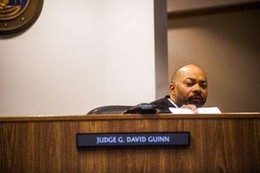 Genesee District Judge David Guinn authorizes charges Wednesday, June 14, 2017, in Flint, Mich., for Department of Health and Human Services Director Nick Lyon and Chief Medical Executive Dr. Eden Wells in relation to the Flint water crisis. Lyon is accused of failing to alert the public about an outbreak of Legionnaires' disease in the Flint area, which has been linked by some experts to poor water quality in 2014-15. Wells was charged with obstruction of justice and lying to a police officer. (Jake May/The Flint Journal-MLive.com via AP)