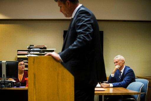 Special Agent Jeff Seipenko, center, listens as Genesee District Judge David Guinn authorizes charges Wednesday, June 14, 2017, in Flint, Mich., for Department of Health and Human Services Director Nick Lyon and Chief Medical Executive Dr. Eden Wells in relation to the Flint water crisis. Lyon is accused of failing to alert the public about an outbreak of Legionnaires' disease in the Flint area, which has been linked by some experts to poor water quality in 2014-15. Wells was charged with obstruction of justice and lying to a police officer. (Jake May/The Flint Journal-MLive.com via AP)