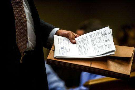 Special Agent Jeff Seipenko walks out of the courtroom with signed paperwork in hand after Genesee District Judge David Guinn authorized charges Wednesday, June 14, 2017, in Flint, Mich., for Department of Health and Human Services Director Nick Lyon and Chief Medical Executive Dr. Eden Wells in relation to the Flint water crisis. Lyon is accused of failing to alert the public about an outbreak of Legionnaires' disease in the Flint area, which has been linked by some experts to poor water quality in 2014-15. Wells was charged with obstruction of justice and lying to a police officer. (Jake May/The Flint Journal-MLive.com via AP)