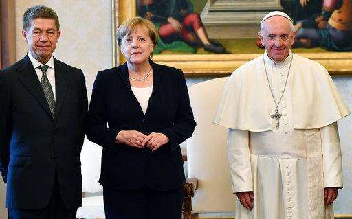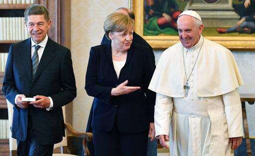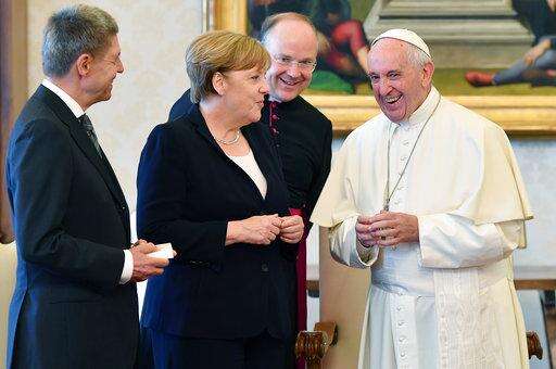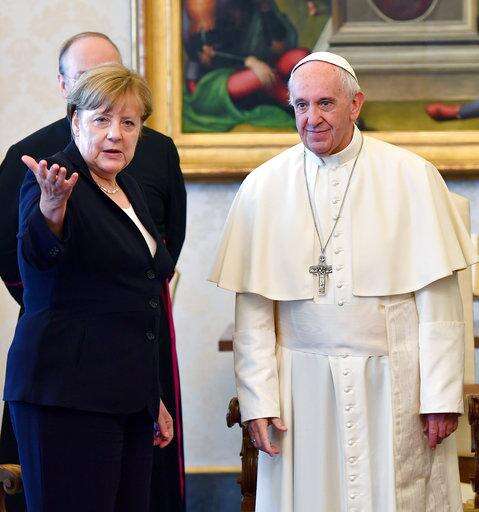 VATICAN CITY (AP) - German Chancellor Angela Merkel says Pope Francis encouraged her to work to preserve the historic Paris climate accord despite the U.S. withdrawal from it and shared her goal to "bring down walls" between countries, not build them.