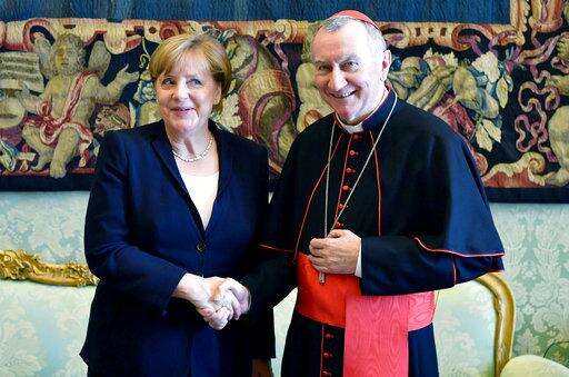 German Chancellor Angela Merkel shakes hands with Vatican Secretary of State Pietro Parolin following of her private audience with Pope Francis, at the Vatican, Saturday, June 17, 2017. (Ettore Ferrari/Pool Photo via AP)
