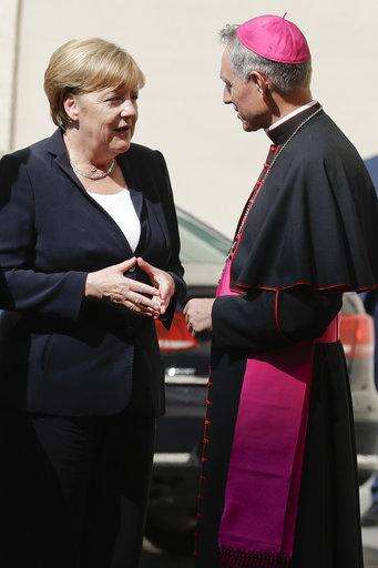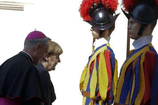 German Chancellor Angela Merkel, accompanied by Vatican Prefect of the Pontifical Household, Archbishop Georg Ganswein, left, arrives at the San Damaso courtyard ahead of her private audience with Pope Francis, at the Vatican, Saturday, June 17, 2017. (AP Photo/Andrew Medichini)