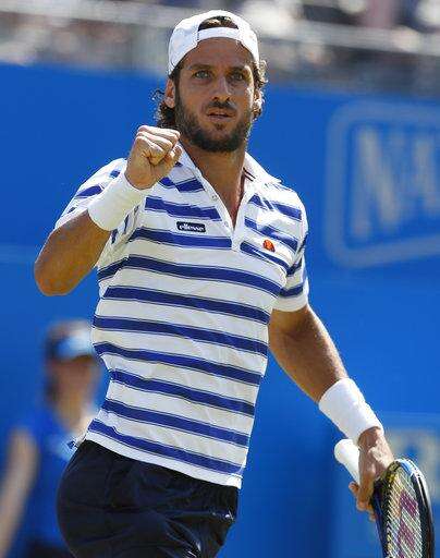 Feliciano Lopez of Spain celebrates winning the first set against Stan Wawrinka of Switzerland during day two of the Queen's Club tennis tournament in London, Tuesday, June 20, 2017. (AP Photo/Kirsty Wigglesworth) The Associated Press