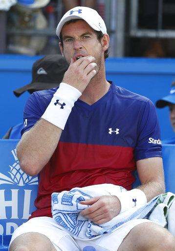 Andy Murray of Britain sits in the chair between games as he plays against Jordan Thompson of Australia during day two of the Queen's Club tennis tournament in London, Tuesday, June 20, 2017. (AP Photo/Kirsty Wigglesworth) The Associated Press