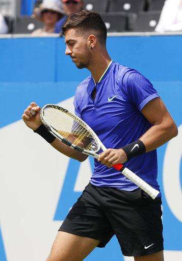 Thanasi Kokkinakis of Australia celebrates winning the first set against Milos Raonic of Canada during day two of the Queen's Club tennis tournament in London, Tuesday, June 20, 2017. (AP Photo/Kirsty Wigglesworth) The Associated Press