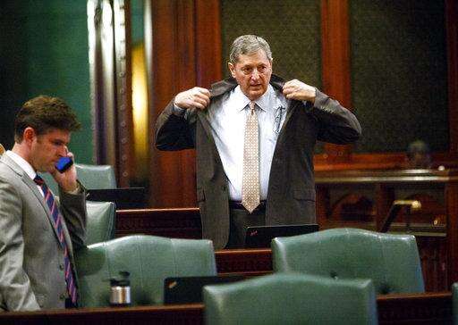 Rep. David Harris, R-Mount Prospect, slips on his suit coat as the special session is called to order at the Capitol Wednesday, June 21, 2017 in Springfield, Ill. Gov. Bruce Rauner called lawmakers to Springfield for a 10-day session in an effort to reach a budget deal before the end of the fiscal year June 30. (Rich Saal/The State Journal-Register via AP) The Associated Press