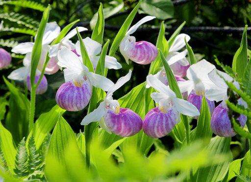 The bulbous pink and white showy lady's slippers (Cypripedium reginae) are on full display among the ferns, bushes and chirping birds at Eshqua Bog in Hartland.