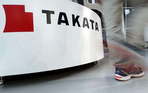In this May 10, 2017 photo, a visitor walks past the logo of Takata Corp. at a Toyota showroom in Tokyo. Japanese air bag maker Takata Corp. filed for bankruptcy protection in Tokyo on Monday, June 26, 2017 and the U.S., drowned in a sea of lawsuits and recall costs. (AP Photo/Shizuo Kambayashi) The Associated Press