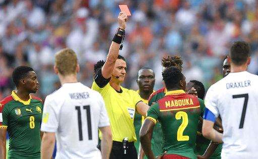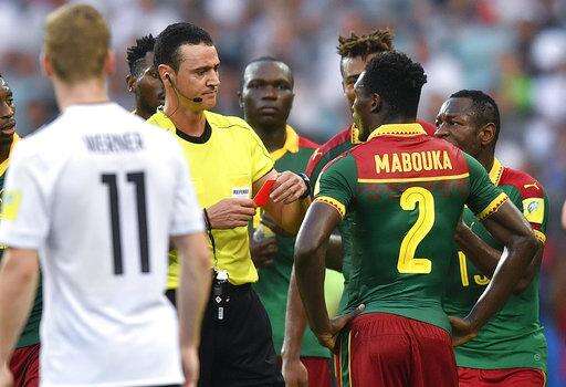 Referee Wilmar Roldan shows a red card to Cameroon's Ernest Mabouka during the Confederations Cup, Group B soccer match between Germany and Cameroon, at the Fisht Stadium in Sochi, Russia, Sunday, June 25, 2017. (AP Photo/Martin Meissner) The Associated Press