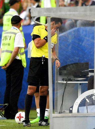 Colombian referee Wilmar Roldan watches a monitor next to the pitch, during the Confederations Cup, Group B soccer match between Germany and Cameroon, at the Fisht Stadium in Sochi, Russia, Sunday, June 25, 2017. (AP Photo/Martin Meissner) The Associated Press