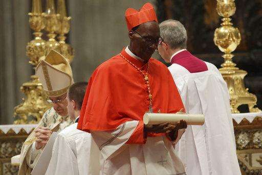 New Cardinal Jean Zerbo, of Mali, leaves after he received the red three-cornered biretta hat from Pope Francis during a consistory inside the St. Peter's Basilica at the Vatican, Wednesday, June 28, 2017. (AP Photo/Alessandra Tarantino)