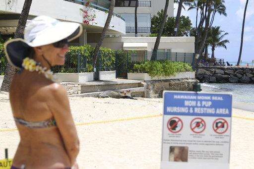 This Thursday, June 29, 2017 photo shows a beachgoer near a Hawaiian monk seal and her newborn pup on a Waikiki beach in Honolulu. The pup, born late Wednesday or early Thursday, is the first seal to be born in the densely populated tourist district since the National Oceanic and Atmospheric Administration began keeping track in the 1970s. (AP Photo/Audrey McAvoy)