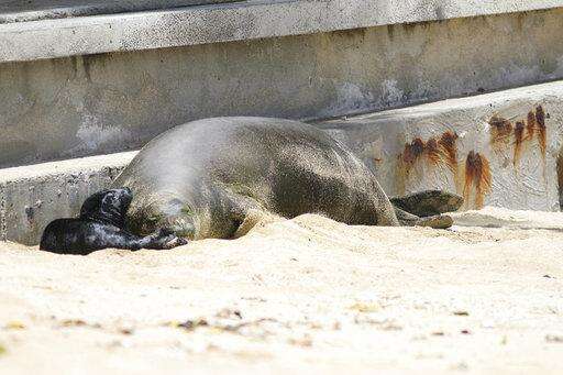 This Thursday, June 29, 2017 photo shows a Hawaiian monk seal and her newborn pup on a Waikiki beach in Honolulu. The pup, born late Wednesday or early Thursday, is the first seal to be born in the densely populated tourist district since the National Oceanic and Atmospheric Administration began keeping track in the 1970s. (AP Photo/Audrey McAvoy)
