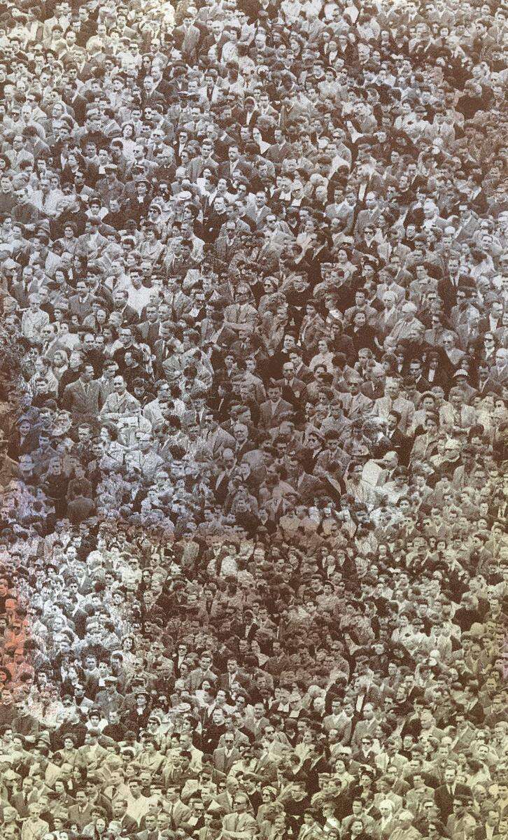 I have used Crowd a couple of times in powder rooms - it's a true conversation starter. The wallpaper is an amalgamation of images - one a 1955 newswire photo taken at St. Peter's Square in Rome on Easter Sunday, the other an image of Warhol from the set of the underground film "Chelsea Girls" in which he is wearing a striped "Where's Waldo?"-style shirt. The trick is to try to spot Warhol in the crowd. Needless to say, powder room users linger a bit longer than usual, hunting for Andy.